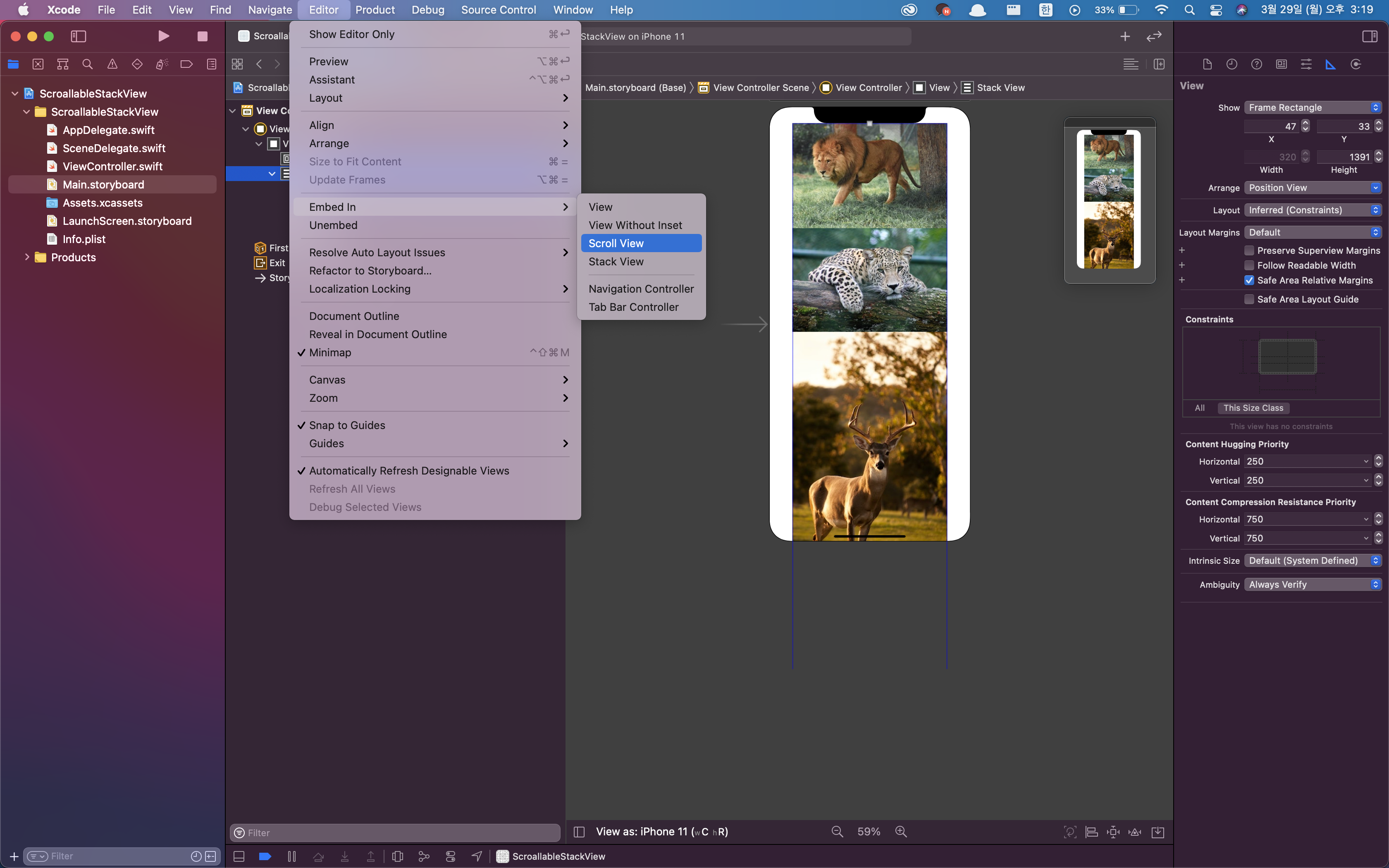 2. StackView를 선택하고 상단 메뉴에서 Editor > Embed In > Stack View 를 선택하여 ScrollView를 Embed 합니다.