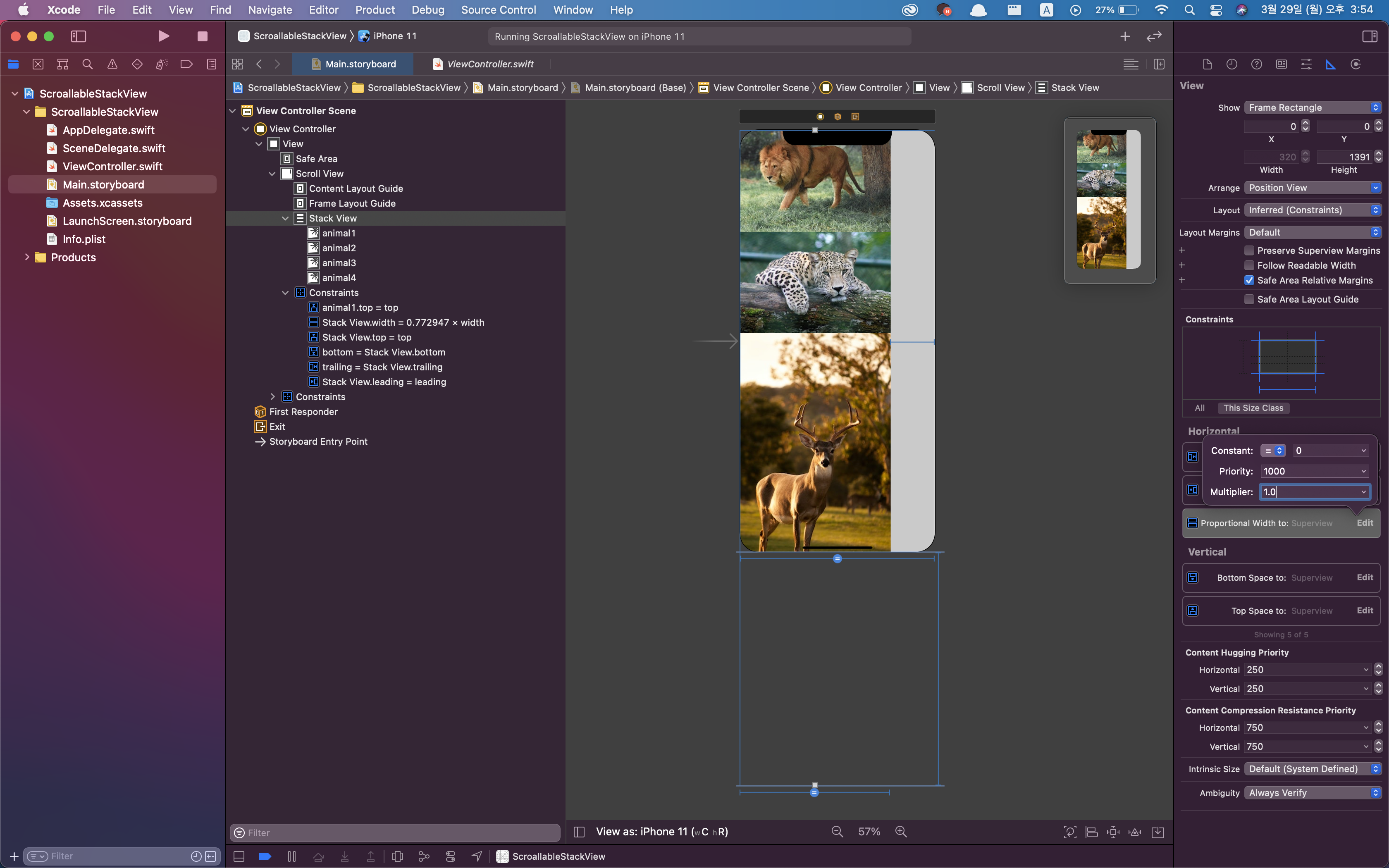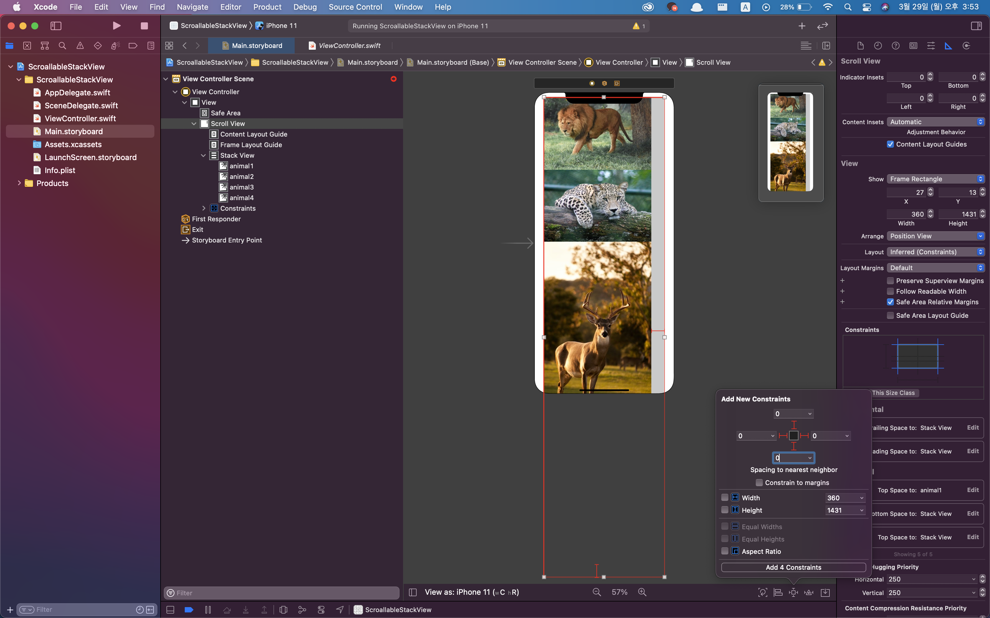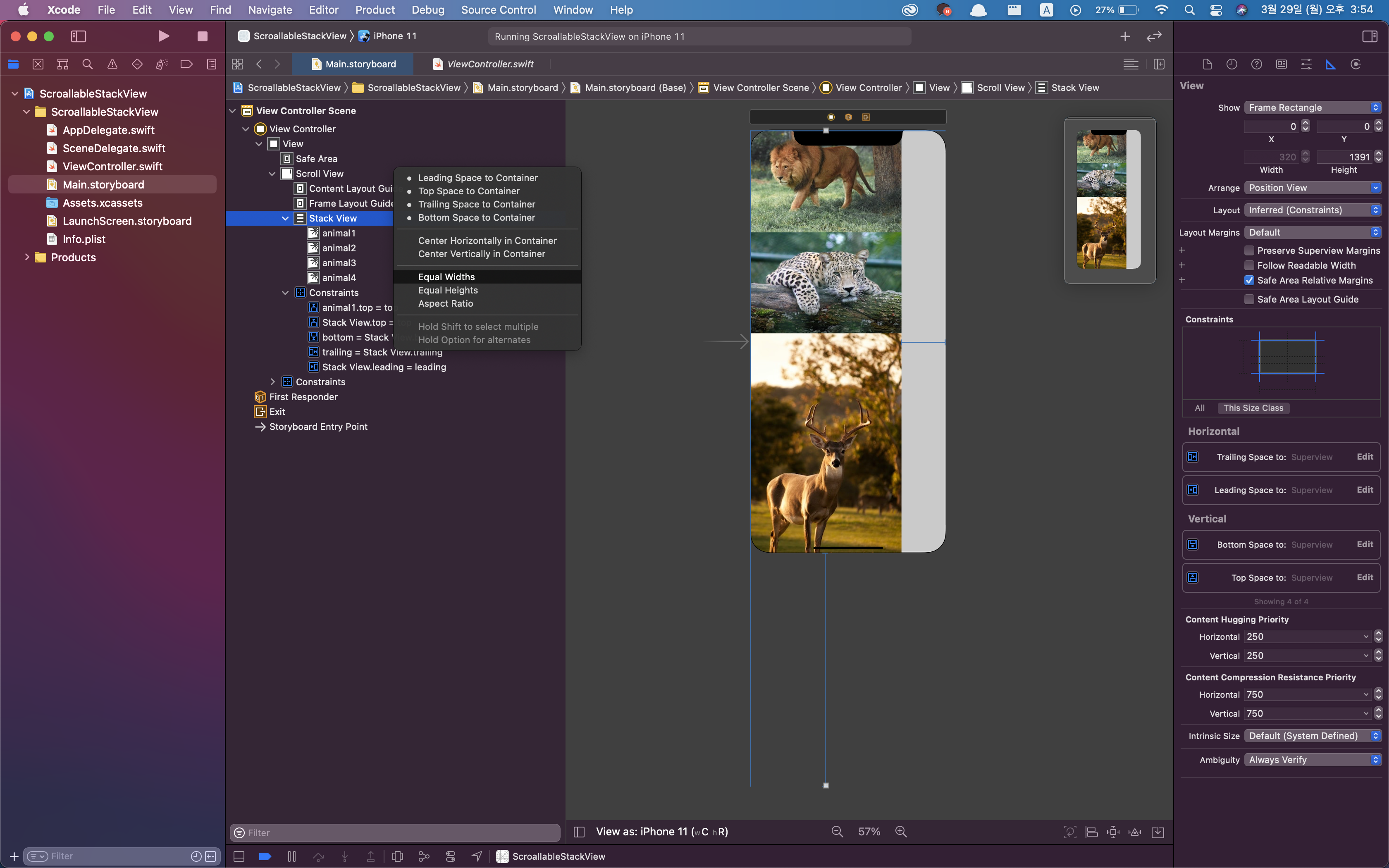 5. 다시 StackView를 선택 후 마우스를 누른 채 ScrollView로 드래그 드랍하여 equal width constraint를 적용합니다.