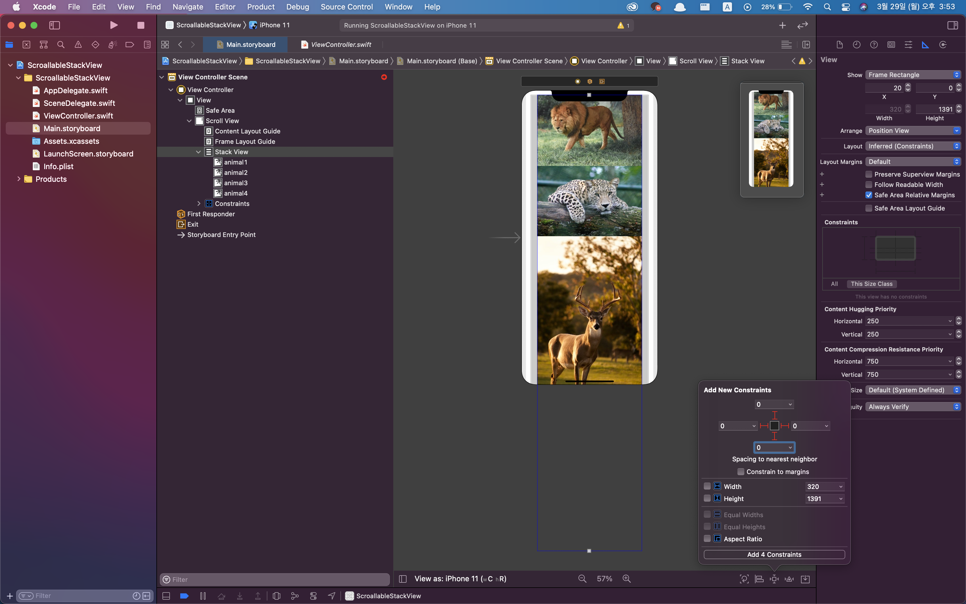 1. Vertical StackView를 추가하고 StackView의 subviews로 4개의 이미지 뷰를 순서대로 추가합니다.